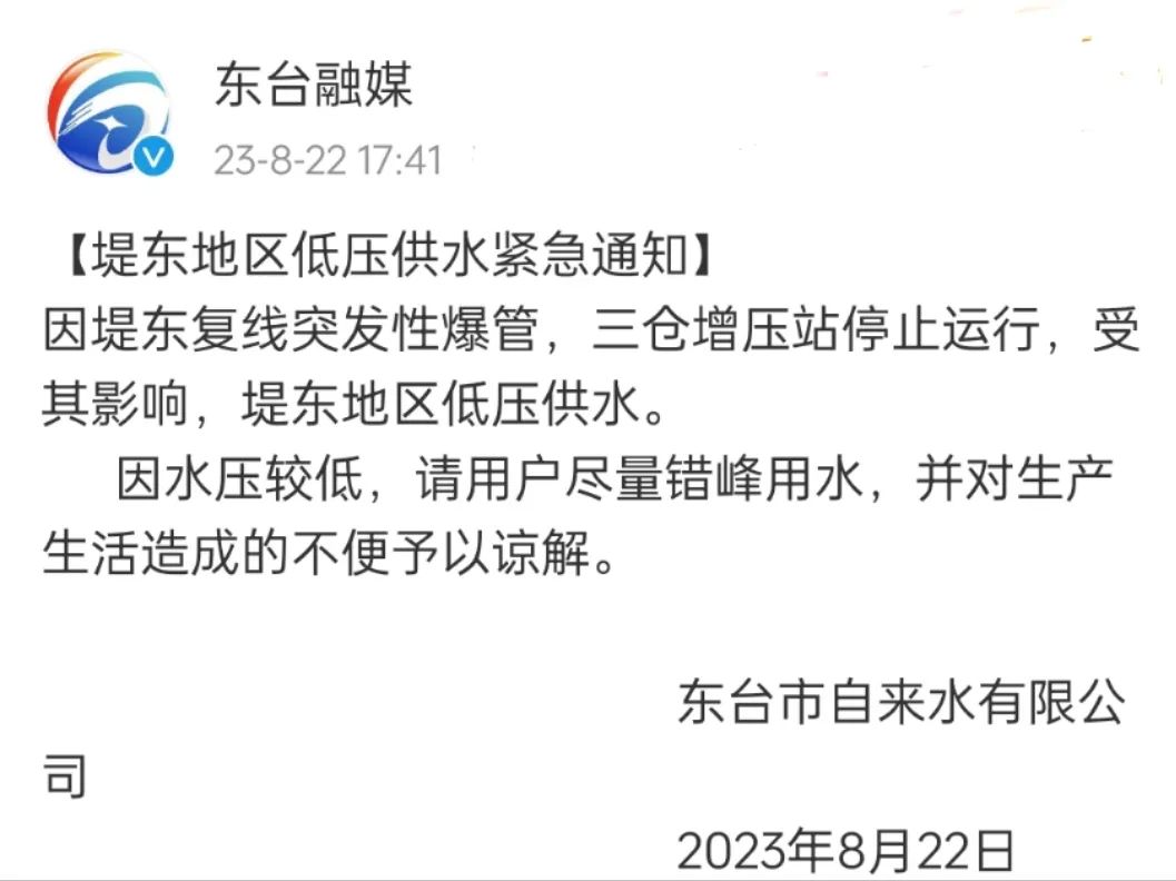 8月22日,東臺市自來水有限公司發(fā)布公告稱,因堤東復線突發(fā)性爆管,三倉增壓站停止運行,受其影響,堤東地區(qū)低壓供水。